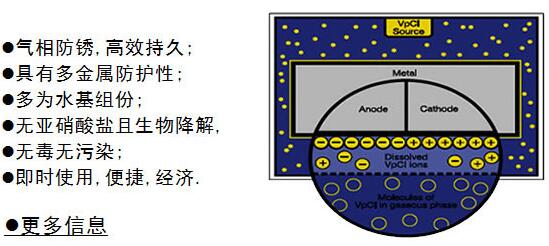 CORTEC VpcI(Vapor Corrosion Inhibitor)氣相防銹技術是通過在產品包裝或密閉空間 內產生緩蝕氛圍來保護金屬的防銹技術。在CORTEC VpCI防銹包裝材料,防銹粉末顆粒 或防銹液體中的VpCI離子通過空氣揮發并附著在金屬表面形成無形的VpCI防護層,以阻 止氧,潮濕氣氛以及其它腐蝕性成分對金屬表面的侵蝕。該VpCI防護層并不改變金屬表 面特性。被防護金屬零件或設備在從包裝或密閉空間取出后,由于其表面VpCI防護層將 自動散去,可直接投入使用,無需表面清潔或去脂。